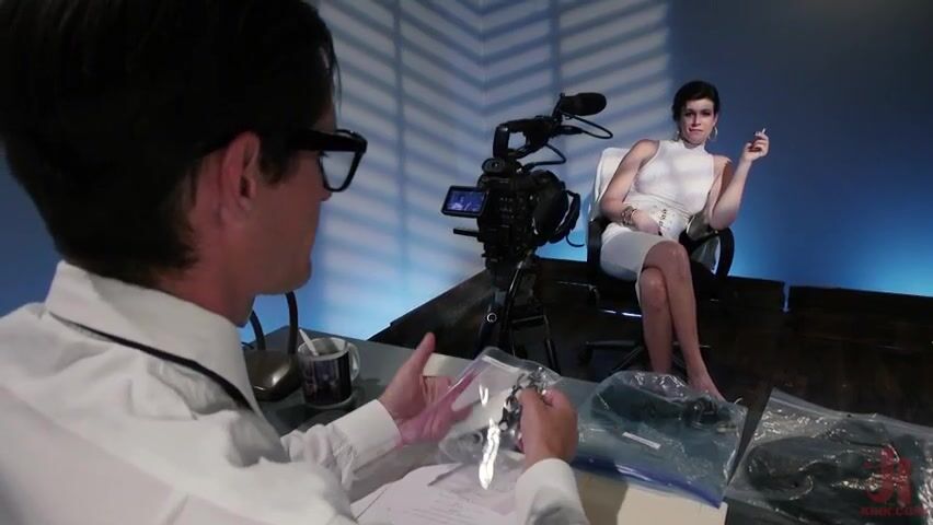 Kendall Penny, dressed entirely in white, enters an interrogation room at the FBI. Detective Tony Orlando has summoned her to question her about the recent death of Mr. Boz. As she sits in front of a camera recording, Detective Orlando inquires about evidence found at the crime scene - evidence bags containing tools used for BDSM activities. Confused by this unfamiliar practice, Tony asks Kendall to explain. In response, she spreads her legs and gives him a glimpse of her hard cock underneath her short skirt. This provokes Detective Orlando to approach her, and she commands him to kneel and open his mouth. She spits into his mouth and extinguishes her cigarette on his tongue. Grabbing him by the hair, she forces his mouth onto her hard cock, which he takes deep into his throat. She then bends him over a chair, whips his ass with her belt, and thrusts her fingers deep into his anus. After sitting him back down in the chair, she places a latex hood over his head. She slaps his chest and attaches clover clamps to his nipples before stuffing her cock back into his mouth and fucking his face. She then orders him to lick her feet, which he does immediately and obediently. Kendall then blindfolds Tony and tortures him with a taser. Moving to a dirty mattress, she cuffs his ankles to his wrists and proceeds to fuck his ass hard and raw. She flips him over into doggy style and continues to penetrate his ass. Finally, she puts him in a reverse headlock and smothers his mouth and nose with her sweaty armpit while she jerks his cock. Her pheromones drive him crazy with desire, and he climaxes all over himself. Kendall jerks her cock with her balls still in Tony's mouth and shoots her load onto his face.